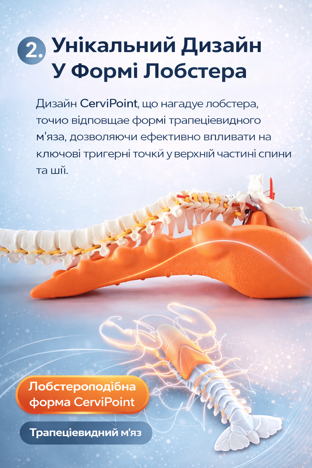 Унікальна лобстероподібна форма точно відповідає вигину хребта, дозволяючи ефективно впливати на ключові точки напруги без зайвого тиску